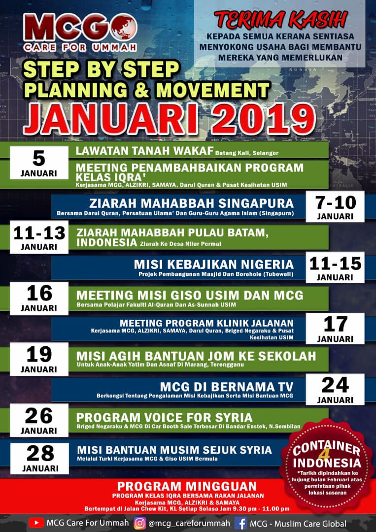 Insha’Allah. Usaha dan Aktiviti MCG utk membantu Ummah akan berterusan dari masa ke semasa. Utk memastikan kelangsungan usaha-usaha membantu ummah ini, kami MCG akan meneruskan Kempen Kutipan Dana MCG antaranya adalah: