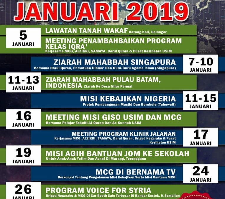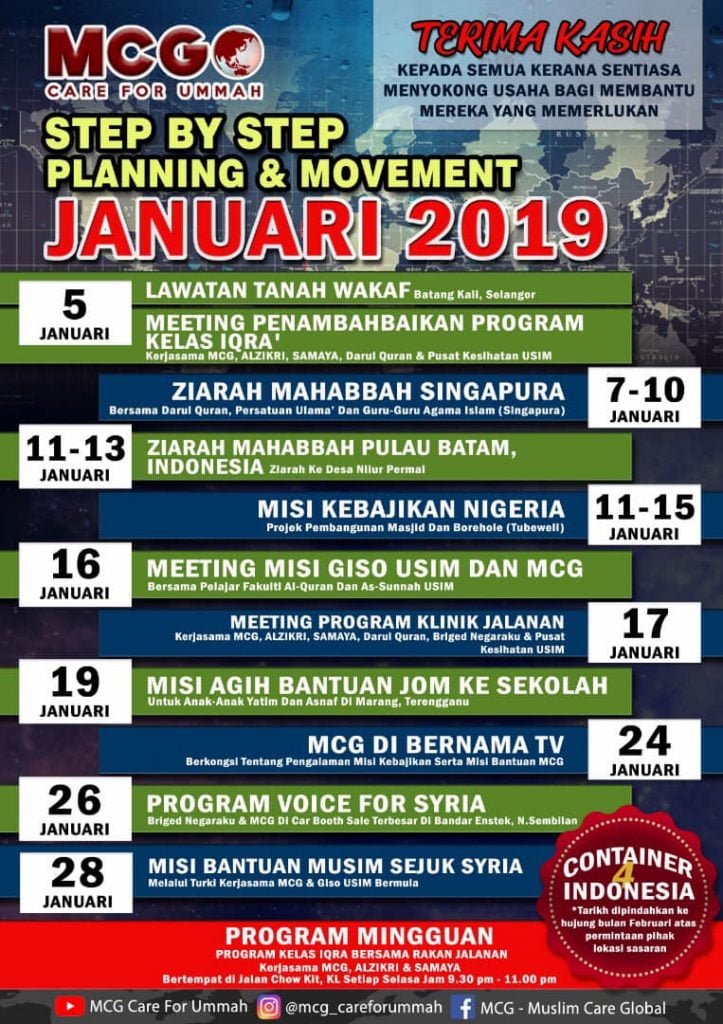 Berkat sokongan dan sumbangan sahabat-sahabat dan para penderma serta keizinan dari Ilahi, MCG telah berjaya mewarnai awal tahun 2019 ini dengan berbagai program berbentuk pendidikan, dakwah, kebajikan, kemanusiaan, pembangunan kemudahan ummah dan seumpamanya baik di dalam mahupun di luar negara. Terima kasih kepada sahabat-sahabat dan semua penderma. Tanpa sokongan dan sumbangan ini, ianya adalah sukar buat kami MCG menjayakan usaha-usaha membantu ummah di merata pelusuk dunia.