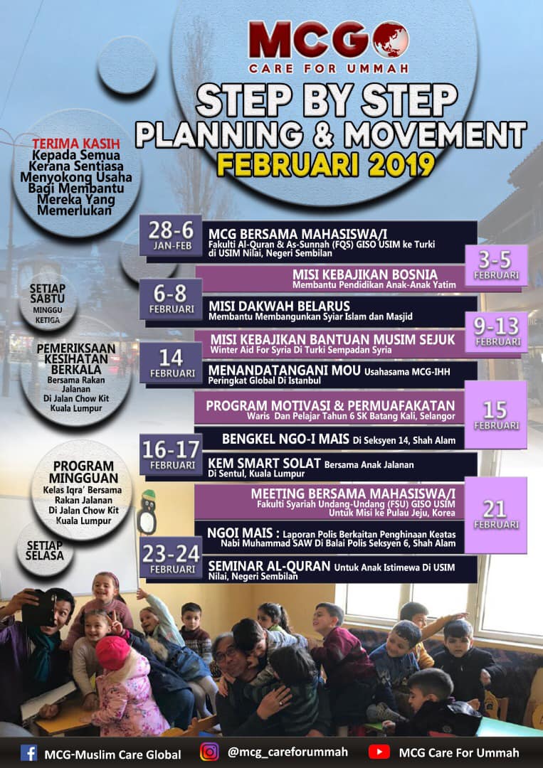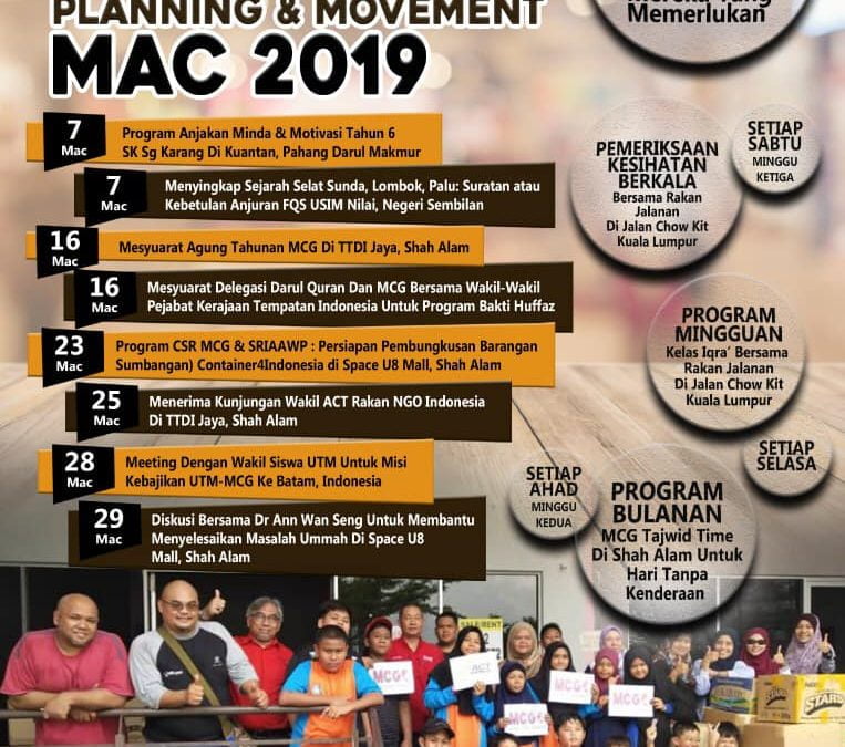 Berkat sokongan dan sumbangan Sahabat2, Rakan-rakan NGO, Entiti Kerajaan dan Para Penderma serta keizinan dari Ilahi, MCG telah berjaya mewarnai bulan March 2019 lalu dengan berbagai program berbentuk pendidikan, dakwah, kebajikan, kemanusiaan, pembangunan kemudahan ummah dan seumpamanya baik di dalam mahupun di luar negara.