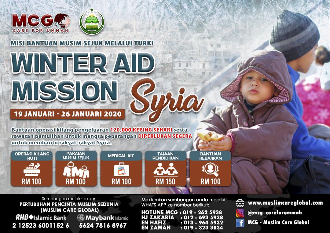 Pada 19 – 26 Januari 2020, seramai 20 orang delegasi dikalangan sukarelawan dan penderma MCG akan menyertai misi Winter Aid Syria, mereka akan menilai sendiri usaha-usaha yang dilakukan oleh MCG dan rakan NGO kami di Turki dalam membantu pelarian Syria. Segala kos operasi misi ditanggung oleh peserta misi sendiri.