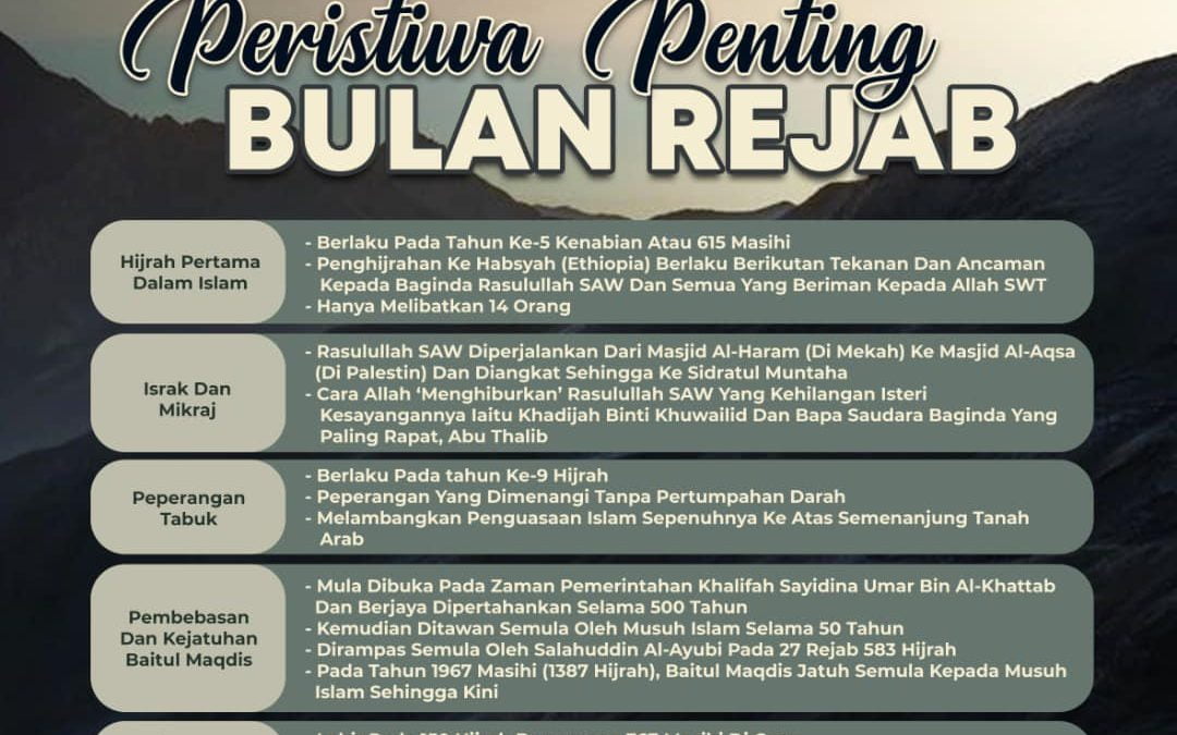 Sempena meraikan bulan Rejab, kami MCG ingin berkongsi dan mengajak sahabat-sahabat untuk bersama-sama menghayati perkongsian ringkas 5 peristiwa yang berlaku di Bulan Rejab serta mengambil pengajaran dan ibrah yang terdapat dari peristiwa tersebut.